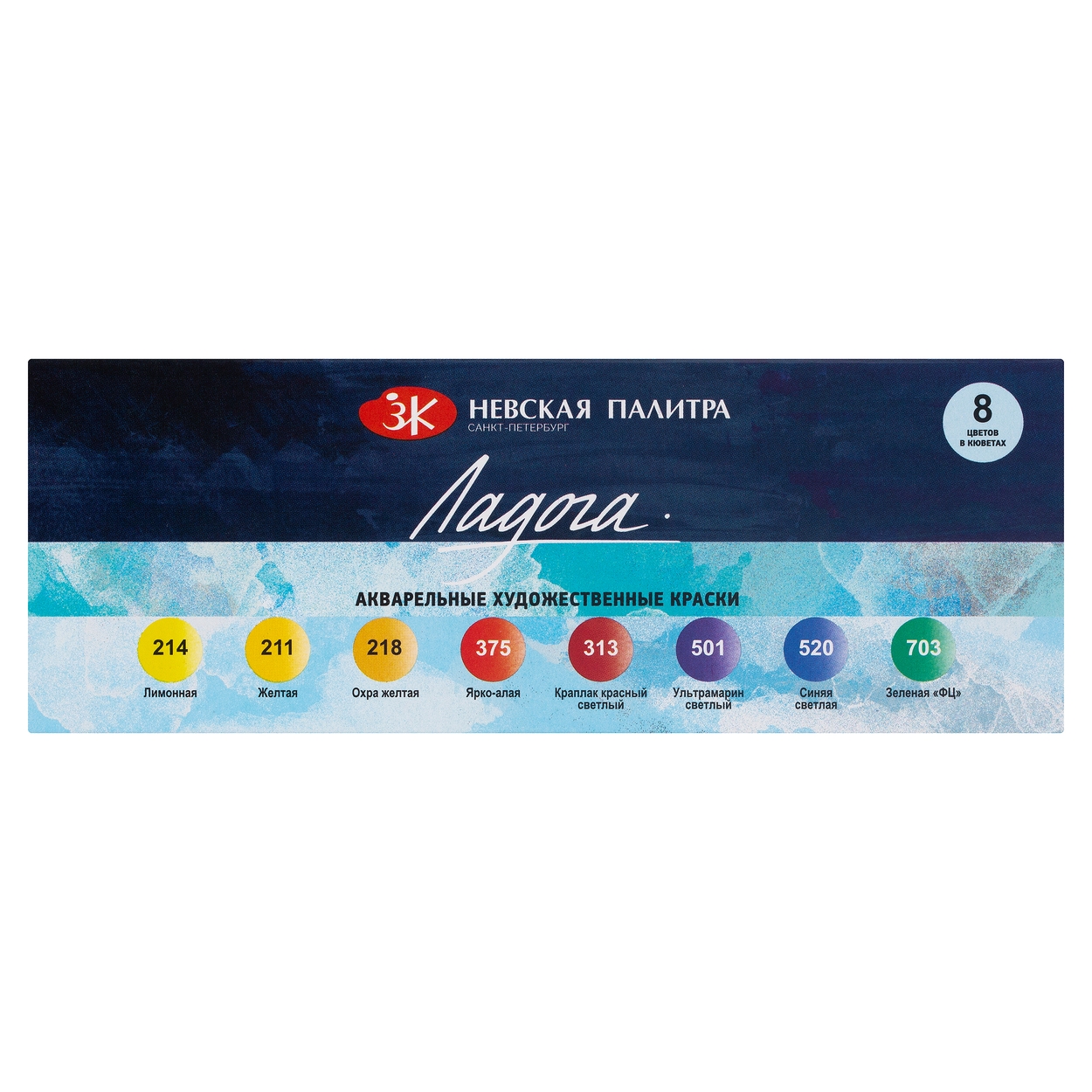 Профессиональные художественные акварельные краски «Ладога» изготавливаются на основе натурального гуммиарабика без использования дорогостоящих пигментов в составе. Отличаются прозрачностью и чистотой цвета, что позволяет художнику работать тонкими лессировками, создавать удивительные по красоте красочные смеси. Акварель «Ладога» выпускается в кюветах объёмом 2,5 мл в экономичной упаковке без фольги и этикетки. Набор акварели «Ладога» из 8 цветов представлен в пластиковом коррексе и картонном чехле.